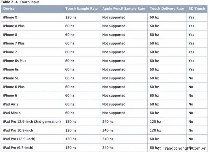 Bạn có thể tham khảo bảng thông số bên dưới, như chiếc iPhone X thực sự chỉ có tần số quét tương tác (tracking rate) là 120Hz (là chiếc iPhone đầu tiên có tần số quét tương tác cao như vậy), trong khi tần số quét (refresh rate) là 60Hz. Màn hình có tần số quét (refresh rate) đạt 120Hz thực sự đã xuất hiện trên dòng sản phẩm của Apple, nhưng là chiếc iPad Pro chứ không phải một chiếc iPhone.