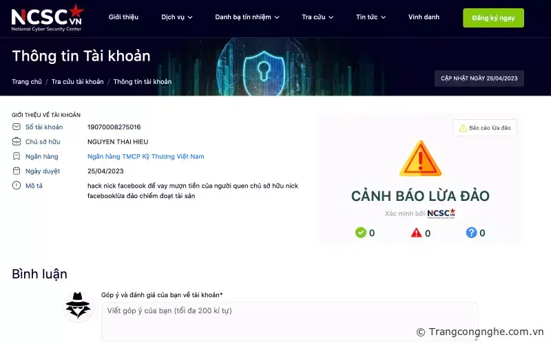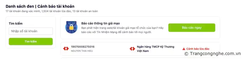 Trả lời: Tính năng tra cứu tài khoản ngân hàng được tích hợp trên hệ thống Tín nhiệm mạng.