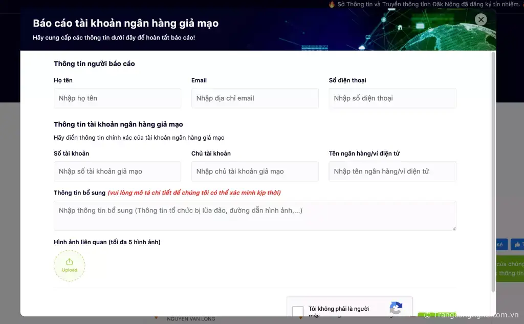 B2: Một khung sẽ hiện thị ra để bạn có thể điền đẩy đủ thông tin rồi bấm nút xanh "Báo cáo"