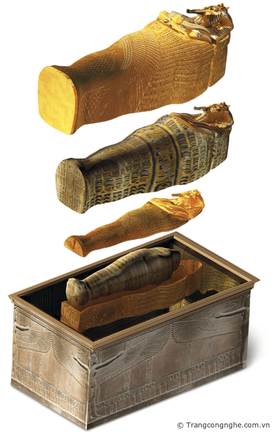 Bước 5: Đặt trong quan tài. Xác ướp được đặt trong một chiếc quan tài tinh xảo, thường làm bằng gỗ hoặc kim loại. Quan tài được trang trí và có thể lồng nhiều quan tài vào nhau. Quan tài tạo lớp bảo vệ cuối cùng cho thi thể, đồng thời mang lại sự tôn nghiêm và ngăn chặn sự mất cắp hoặc hư hỏng.