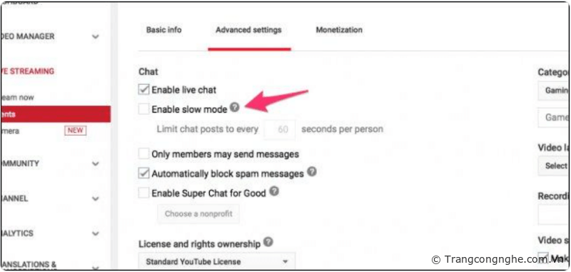 Trong Advanced Settings, bạn có thể cấu hình tùy chọn trò chuyện như bật chế độ chậm và chỉ có thành viên mới có thể gửi tin nhắn trò chuyện.