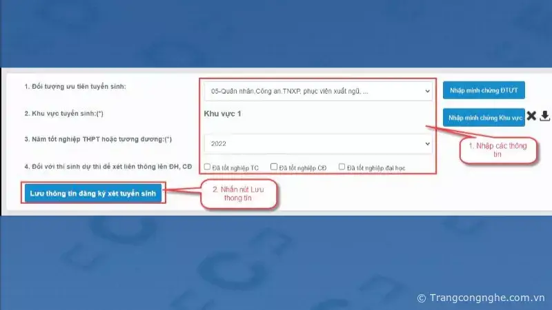 - Đối tượng ưu tiên tuyển sinh: thí sinh cần chọn các mục nếu là đối tượng và nhập minh chứng ĐTƯT.