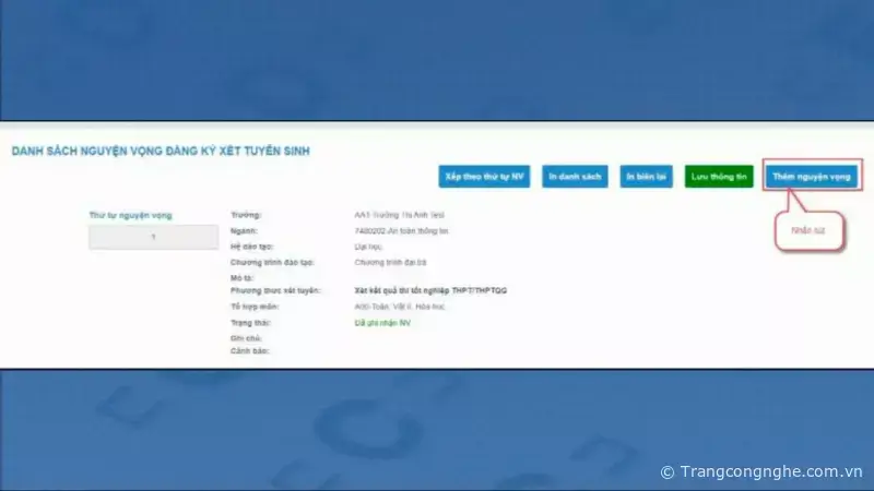 - Thêm nguyện vọng: Chọn biểu tượng “Thêm nguyện vọng” trên màn hình, điền thông tin đăng ký nguyện vọng như hướng dẫn ban đầu.