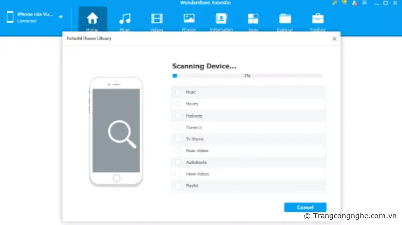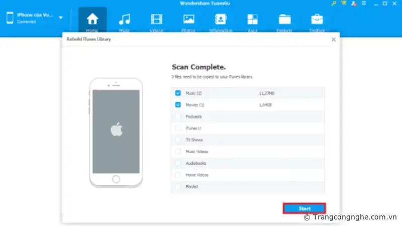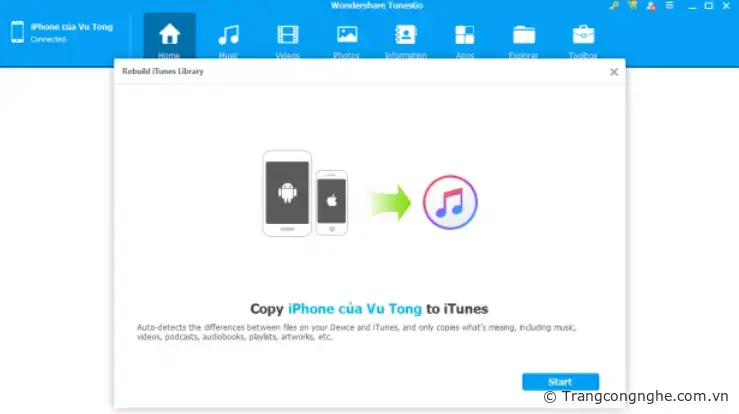 Từ nay người dùng chẳng còn phải lo lắng về vấn để mất khá nhiều thời gian cho việc sao lưu dữ liệu vào iTunes, TunesGo khá tiện ích khi hỗ trợ người dùng xuất nhanh dữ liệu vào iTunes chỉ trong vài bước đơn giản. Chọn tùy chọn Rebuild iTunes Library để xuất dữ liệu.