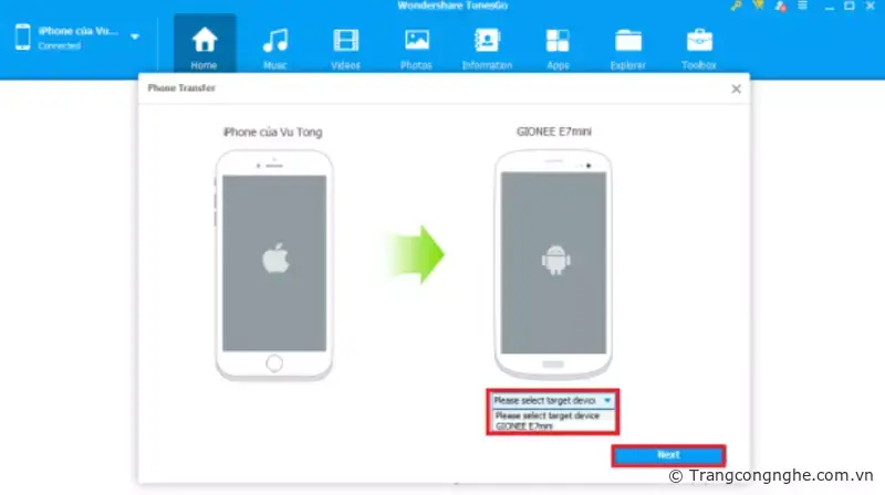 Sau đó chọn Phone to Phone Transfer. Tại đây bạn sẽ được đưa đến một danh sách chứa tên của các thiết bị đang được kết nối với chương trình. Hãy chọn tên thiết bị ở mục Please Select target device. Và chọn Next.