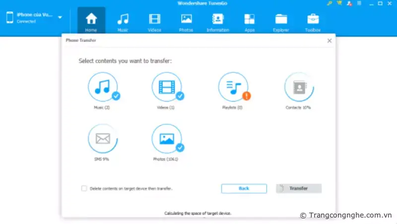 Chương trình sẽ tự động tải, cập nhật toàn bộ dữ liệu từ thiết bị để sẵn sàng cho quá trình chuyển dữ liệu. Việc bạn cần làm chỉ là ngồi đợi cho quá trình cập nhật hoàn tất, lựa chọn các mục cần chuyển và chọn Transfer.