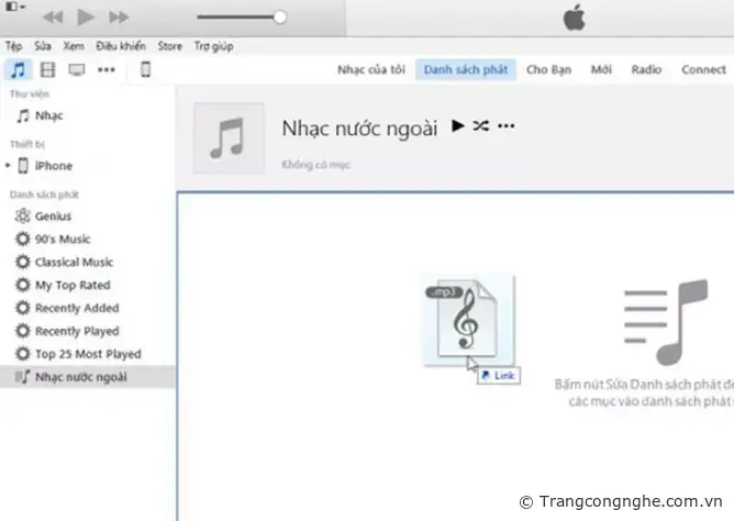 - Bôi đen những bài hát muốn chép, nhấn chuột phải, giữ chuột và kéo thả những bài đó vào thư mục danh sách phát đã tạo trong iTunes.