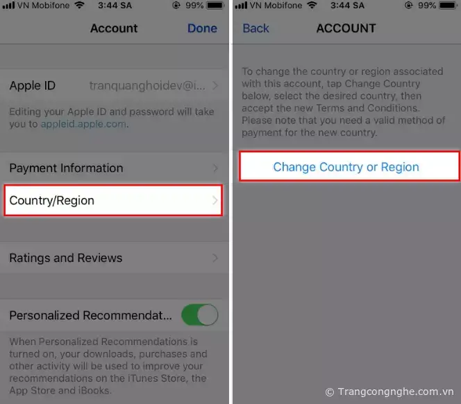 Bước 2: Tiếp đến bạn chọn vào 'Contry/Region' > Change Country or Region.