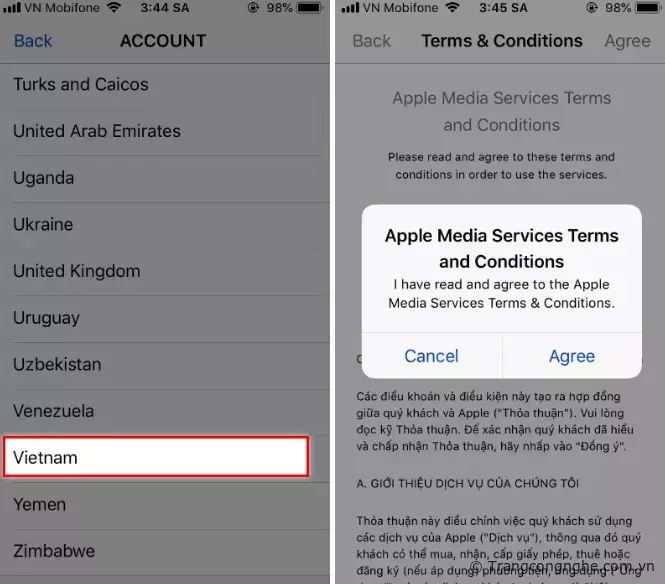 Bước 3: Chọn vào vùng cần chuyển đến, ở đây mình sẽ chọn Việt Nam > Chọn Agree để xác nhận đồng ý các điều khoản đi kèm của Apple.