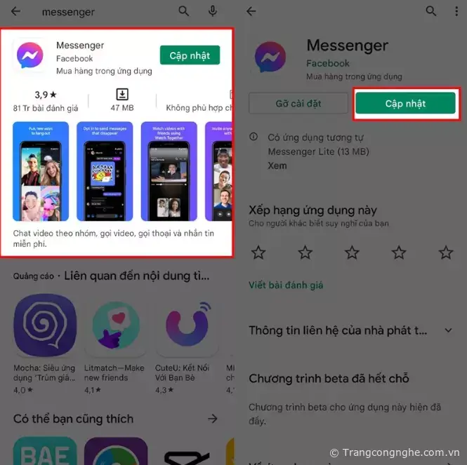 Bước 1: Bạn cần cập nhật Messenger trên điện thoại của bạn lên phiên bản mới nhất nhé. Hãy vào CH Play hay App Store để có thể kiểm tra hoặc bấm vào đường link bên dưới để kiểm tra ngay nhé.