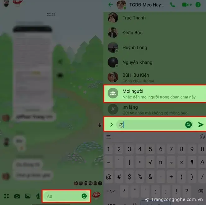 Bước 2: Sau khi cập nhật phiên bản mới thành công thì bạn có thể vào một nhóm chat bất kì mà bạn cần tag mọi người. Sau đó, tại ô soạn tin nhắn thì bạn hãy nhập @ để mở ra bản tag thành viên. Bạn hãy kéo xuống bên dưới cùng bảng các thành viên có thể tag. Bạn sẽ thấy một mục đó là Mọi người, hãy chọn vào đó rồi ấn gửi thôi là bạn đã có thể tag tất cả mọi người được rồi.