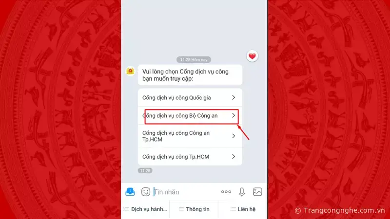 Bước 2: Hệ thống sẽ chuyển sang giao diện trò chuyện của trang OA Zalo này. Phía trên phần nhập tin nhắn, hệ thống hiện một vài tùy chọn. Bạn chọn “Cổng dịch vụ công Bộ Công An”.