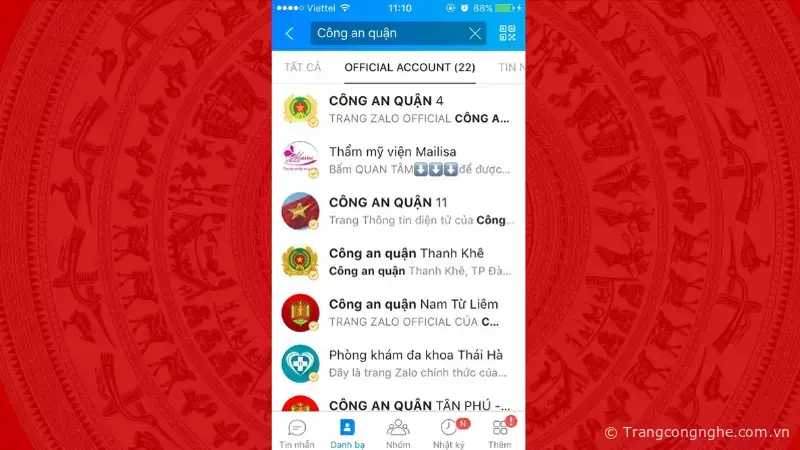 Bước 1: Người dân truy cập vào ứng dụng Zalo trên điện thoại. Nhấn Tìm kiếm Công An quận nơi đã thực hiện đăng ký CCCD đầu tiên. Tiếp theo nhấn Quan tâm để tiếp tục thực hiện.