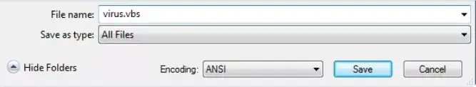 Tiến hành lưu file Notepad lại. Bạn có thể lưu Notepad thành 1 tên bất kỳ mà bạn muốn nhưng phần đuôi mở rộng phải là '.vbs'. Chẳng hạn bạn có thể lưu Notepad thành fakevirus.vbs.