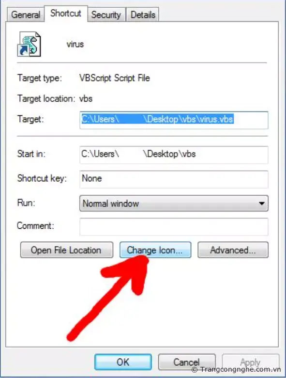 Kích chuột phải vào Shortcut mà bạn vừa tạo, sau đó click chọn Properties. Trên cửa sổ Properties chọn Change icon...., thay đổi biểu tượng Shortcut bằng một biểu tượng nào đó mà bạn nghĩ sẽ bắt mắt 'nạn nhân' bị bạn troll.