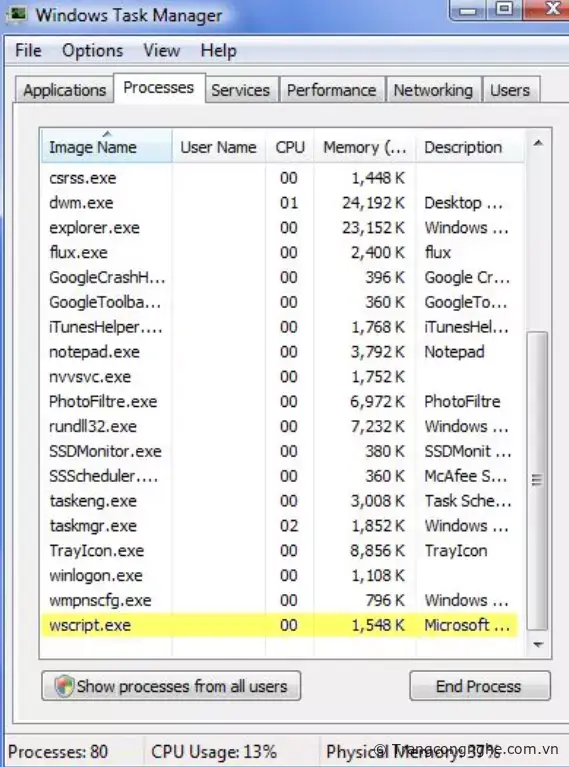 - Bạn có thể tắt chương trình bất cứ lúc nào mà bạn muốn bằng cách mở Task Manager (nhấn tổ hợp phím Ctrl + Alt + Delete), sau đó chọn thẻ Process và kết thúc 'wscript.exe'.