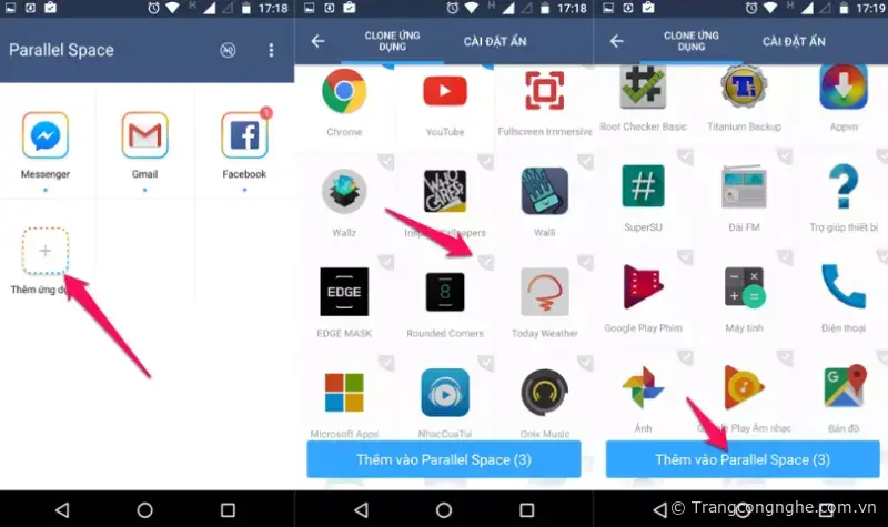 Để 'chép' thêm nhiều ứng dụng khác, bạn nhấn vào biểu tượng dấu + trên giao diện và tích vào các ứng dụng mong muốn, sau đó nhấn vào nút 'Thêm vào Parallel Space'.