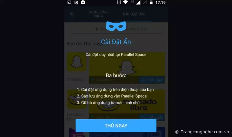 Tab 'Cài đặt ẩn' có tác dụng giúp người dùng ẩn đi những ứng dụng trên màn hình thiết bị, nhưng vẫn được lưu lại trong Parallel Space. Cách thực hiện như sau: Chép ứng dụng bất kỳ vào Parallel Space > trở về màn hình chính và xóa đi bản gốc của ứng dụng đó là xong.