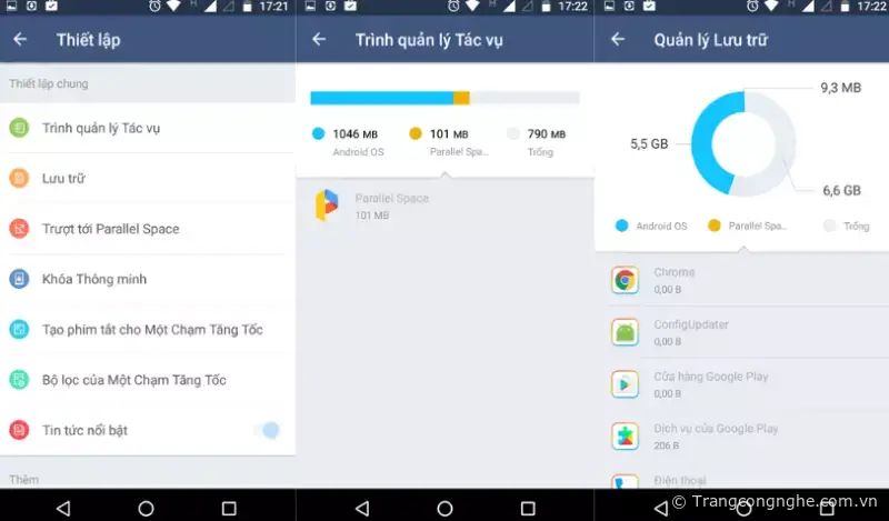 Trong mục Thiết lập, nhà phát triển cung cấp thêm một số tính năng khác như Trình quản lý tác vụ, trượt để mở Parallel Space, quản lý lưu trữ hoặc bộ lọc một chạm tăng tốc v.v...