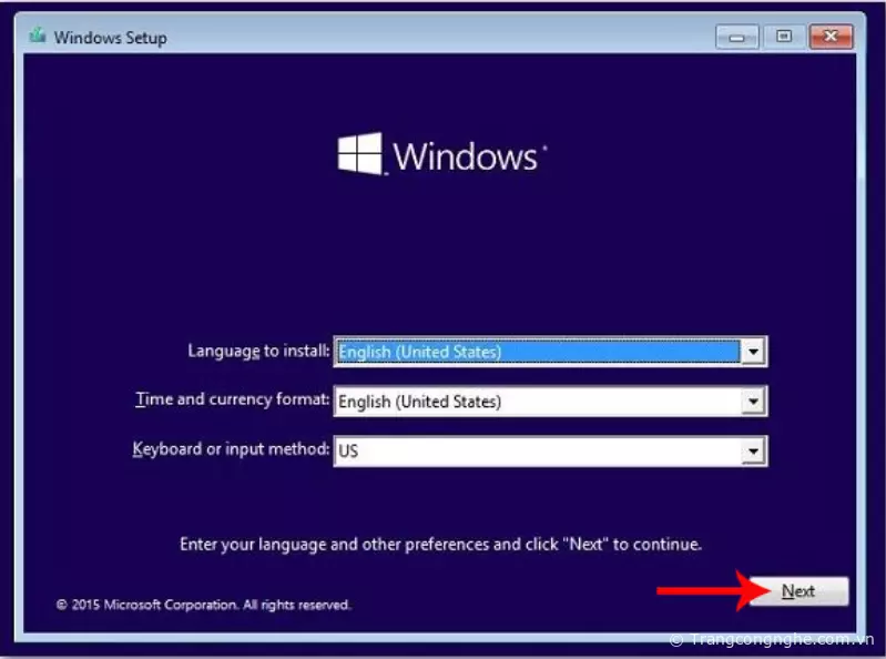 Sau khi thực hiện đầy đủ những bước trên, chúng ta tiến hành cài đặt Windows 10. Đầu tiên chúng ta tiến hành thiết lập thời gian, bàn phím rồi nhấn Next.