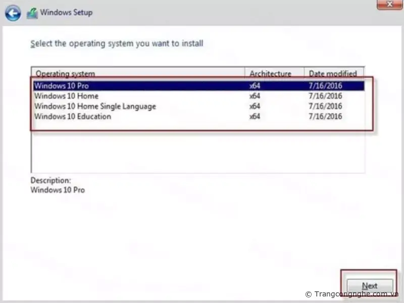 Ngay sau đó, chúng ta sẽ được lựa chọn cài đặt hệ điều hành Windows 10 mà mình muốn có trong danh sách cung cấp, rồi nhấn Next ở bên dưới.