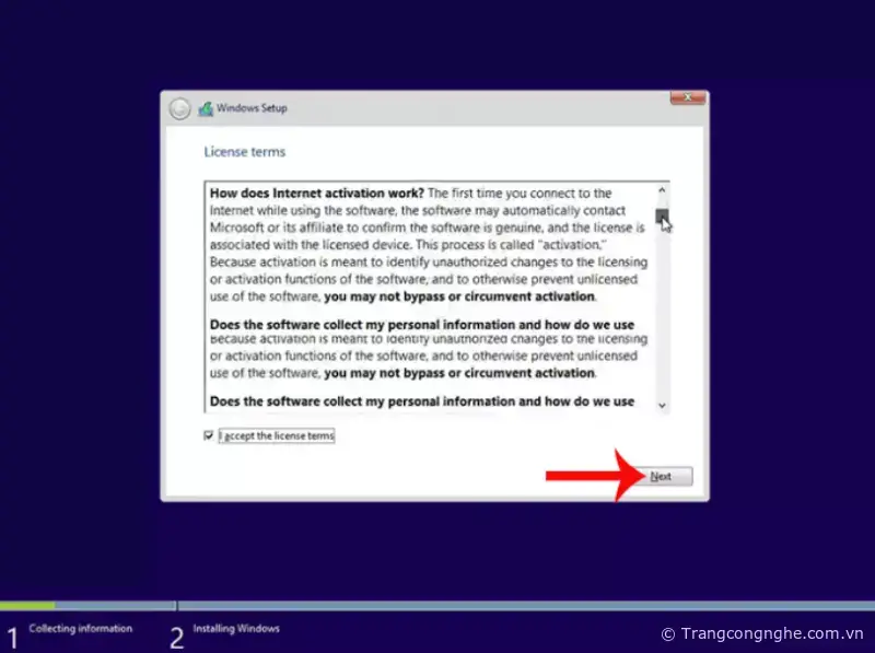 Microsoft sẽ đưa ra những điều khoản sử dụng, nhấp chọn vào I accept the license terms sau đó nhấn Next.