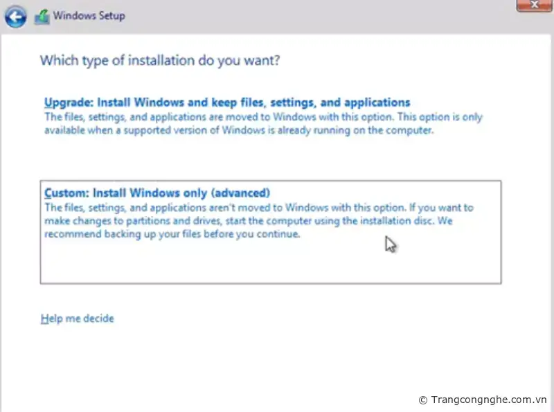 Ở giao diện mới này nhấp chọn vào Custom: Install Windows only (advanced).