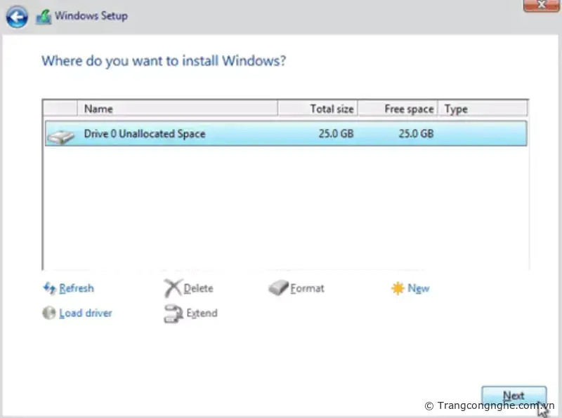 Công việc tiếp theo đó là lựa chọn ổ đĩa cứng muốn cài đặt hệ điều hành rồi nhấn Next để sang bước tiếp theo.