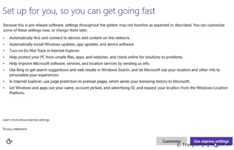 Chúng ta nhấn vào Use Express settings để máy tính thiết lập hệ thống cho lần đầu sử dụng, hoặc nhấn Customize để tiến hành tùy chọn các thiết lập.