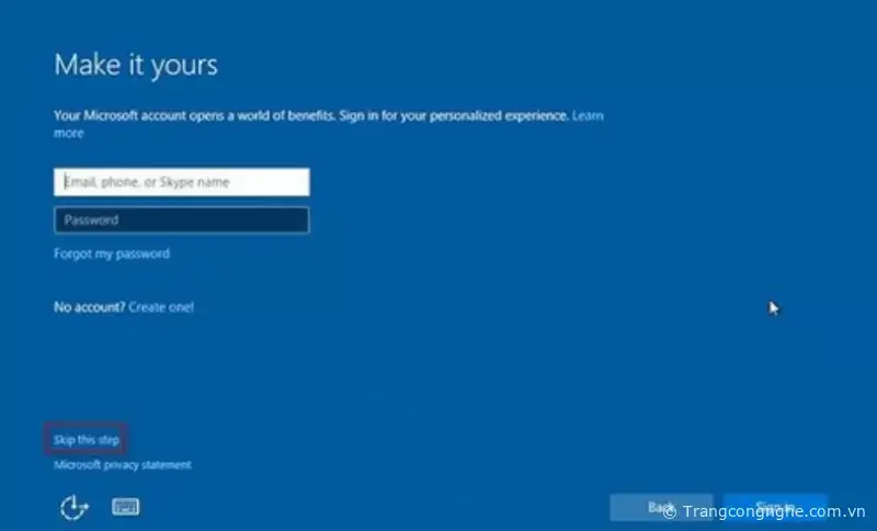 Ở màn hình tiếp theo chúng ta sẽ nhìn thấy giao diện đăng nhập tài khoản Microsoft, nhấn Skip this step để bỏ qua bước đăng nhập tài khoản này.