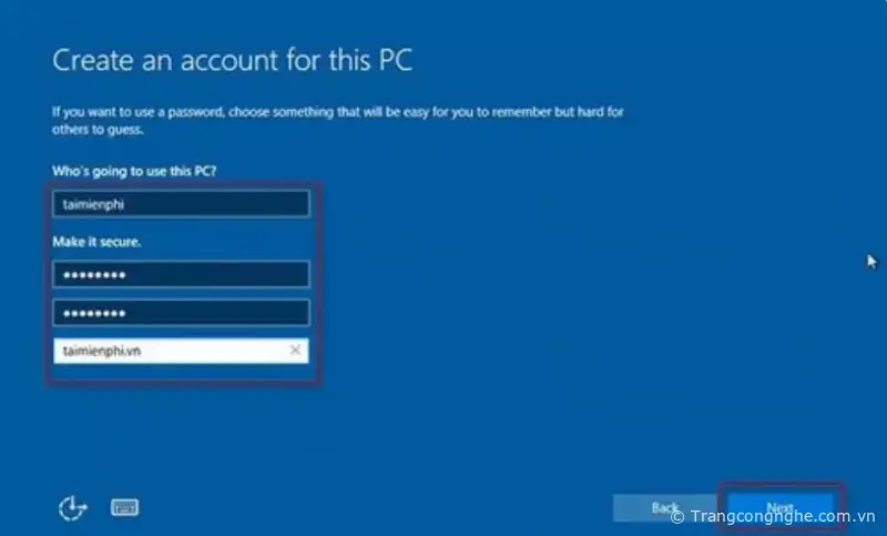 Tiếp đến người dùng tạo tài khoản đăng nhập trên máy tính rồi nhấn Next ở bên dưới.