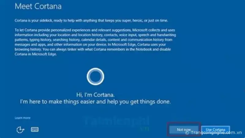 Giao diện giới thiệu trợ lý ảo Cortana sẽ xuất hiện sau đó, nhấn Not now để tạm thời bỏ qua giao diện này.