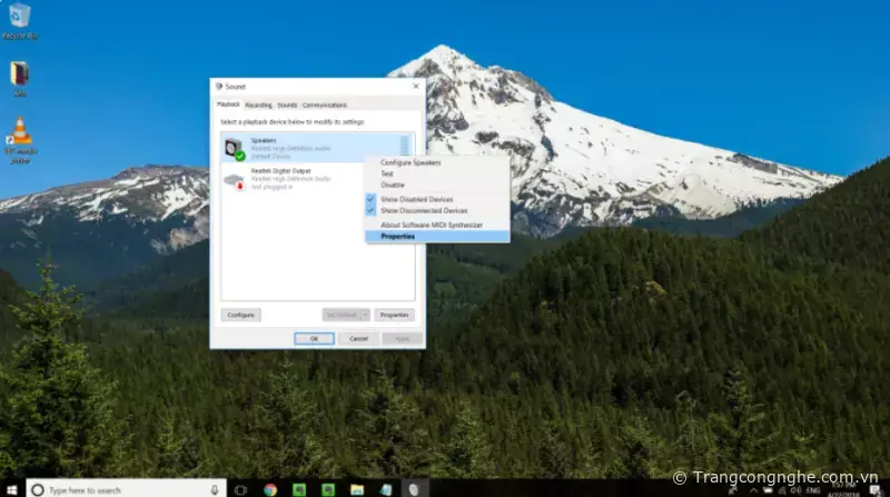 Bước 2: Chọn biểu tượng loa (tai nghe) đang có dấu stick xanh như ảnh. Chuột phải - Properties