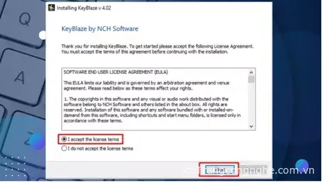 Bước 3: Đồng ý với điều khoản của KeyBlaze Typing Tutor bằng cách nhấn vào ‘I accept the license terms’ và bấm ‘Next’.