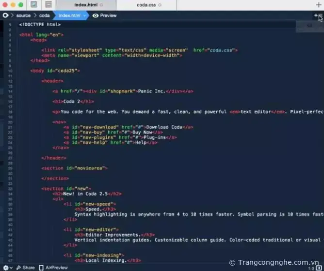 Đây là phần mềm chỉnh sửa văn bản trên Mac dành cho những lập trình viên thích tốc độ và sự tối ưu. Coda hỗ trợ macOS 10.7.5 trở lên và là một trong số ít công cụ biên tập code được thiết kế cẩn thận chỉ dành cho hệ điều hành Mac.