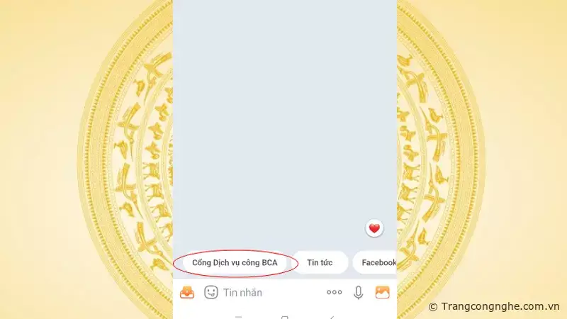 Bước 3: Sau khi kết nối thành công, bạn sẽ được chuyển đến giao diện Trò chuyện với OA. Dưới tin nhắn, bạn lựa chọn danh mục có sẵn. Trong danh mục này, bạn sẽ thấy mục "Cổng dịch vụ công BCA", hãy nhấn vào đó. Tiếp theo, tìm và chọn "Đăng ký, Quản lý phương tiện giao thông cơ giới đường bộ" để tiếp tục.