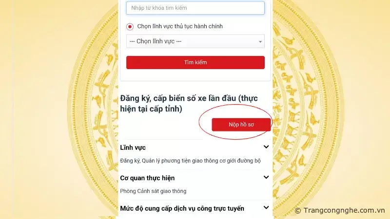 Bước 4: Giao diện sẽ hiển thị các danh mục thủ tục liên quan đến phương tiện. Nếu bạn muốn đăng ký cấp biển số xe mới, chọn “Đăng ký cấp biển số xe lần đầu (thực hiện tại cấp tỉnh)”. Sau đó, bấm vào nút "Nộp hồ sơ" màu đỏ trong giao diện thông tin thủ tục sau khi bạn đã kiểm tra và xác nhận chắc chắn toàn bộ thông tin liên quan đến thủ tục.