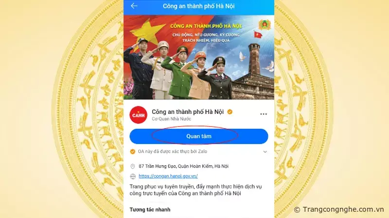 Bước 2: Trên ô tìm kiếm, bạn tìm kiếm trang OA của Công an Quận mà bạn đăng ký biển xe theo cú pháp "Công an Quận/huyện + tên quận/huyện bạn sinh sống". Tiếp theo, ấn nút Quan tâm ở giao diện chính của OA.