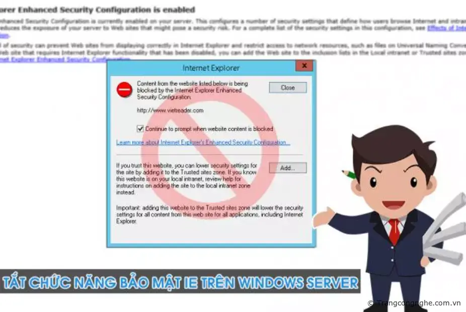 Chào các bạn! Hôm nay Mr.Business sẽ hưỡng dẫn độc giả cách tắt thông báo bảo mật phiền phức Internet Explorer (IE) trên hệ thống máy chủ Windows Server trên các phiên bản 2008 trở lên. Chỉ với một số bước đơn giản các bạn có thể loại bỏ chức năng bảo mật phiền phức đó, nào hãy cùng tôi tiến hành tắt chức năng đó nhé.