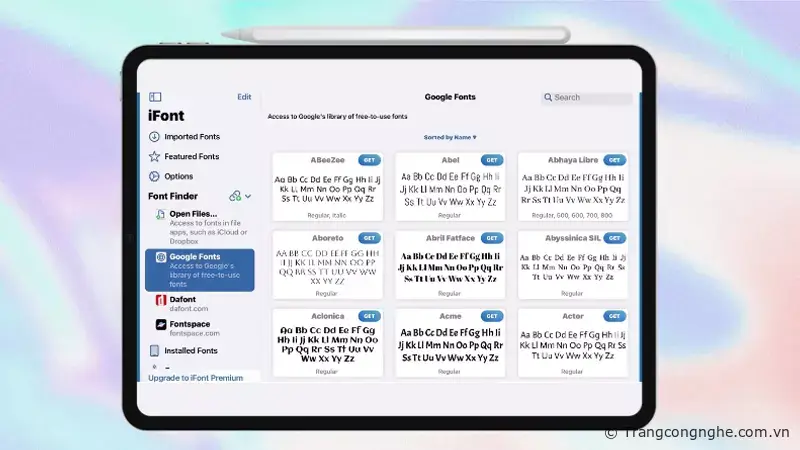 iFont cung cấp phông chữ kèm theo các liên kết dẫn tới các thư viện lớn khác như Google Fonts, Defont và Fontspace. Bạn có thể sử dụng chúng để tìm kiếm phông chữ bạn mong muốn. Nếu đã tìm thấy phông chữ ưng ý, bạn nhấn nút Nhận (Get), sau đó đi tới phần Nhập phông chữ vào iPad của bạn (bên dưới).