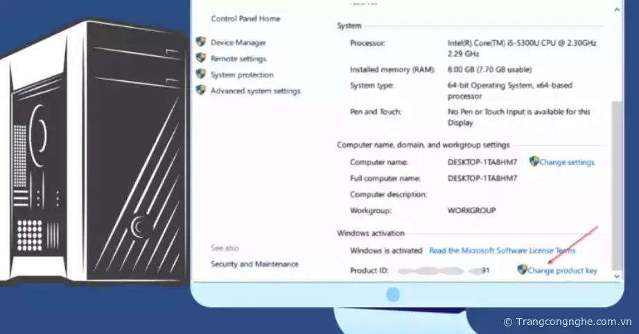 - Bước 2: Tại mục “Windows Activation” > Click chọn vào link “Change product key” > Xuất hiện cửa sổ “User Account Control” bạn hãy click chọn “Yes” để xác nhận.