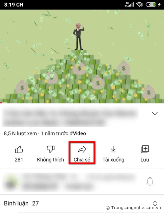 Sau khi video đó được tải lên tài khoản video Youtube của bạn, để chia sẻ video đó với bạn bè của mình qua Messenger, bạn mở tệp video đó lên để phát video đó như bình thường trên điện thoại. Trong giao diện video đang phát, bạn bấm nút Chia sẻ.