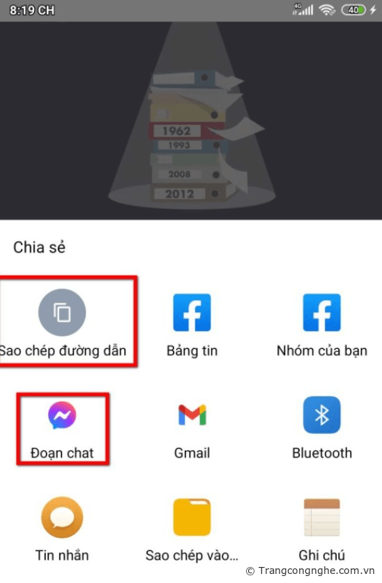 Trong bảng tùy chọn hiển thị bạn có thể chọn trực tiếp ứng dụng Messenger hoặc nếu muốn chia sẻ cho nhiều người khác thông qua nhiều ứng dụng khác nhau, bạn chọn tùy chọn Sao chép đường dẫn để sao chép link của tệp video đó.