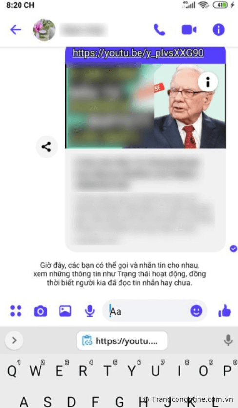 Sau cùng truy cập vào ứng dụng Messenger, chọn người muốn chia sẻ video để truy cập khung chat như bình thường. Bấm giữ vào khung soạn thảo văn bản và chọn Dán để chia sẻ video đó với bạn của mình.