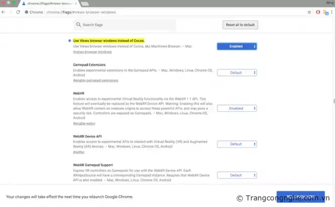 3. Tiếp tục nhập vào thanh địa chỉ đoạn nội dung 'chrome://flags/#views-browser-windows', thay đổi thiết lập từ 'Default' thành 'Enable' và nhấn nút Relaunch Now để khởi động lại trình duyệt một lần nữa. Lúc này, bạn đã có thể trải nghiệm giao diện Chrome mới.