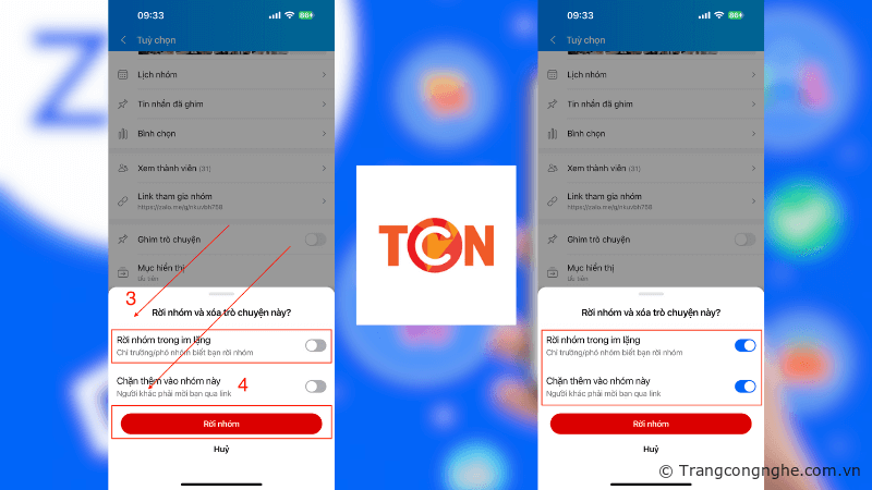 Bạn chọn Rời nhóm trong im lặng (3) thì toàn bộ thành viên trong nhóm sẽ không được thông báo và chỉ Trưởng nhóm/ Phó nhóm mới biết bạn rời nhóm.