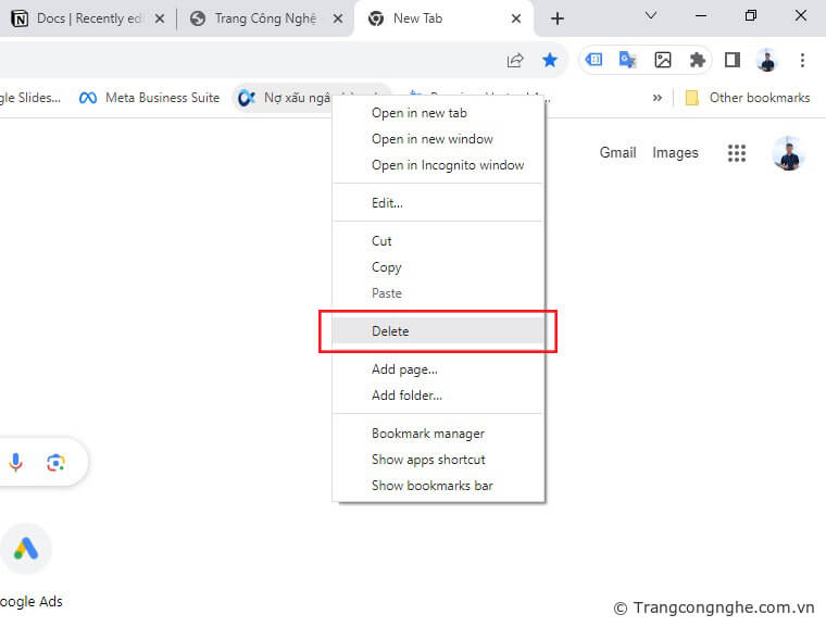 Nhấp chuột phải vào một dấu trang bất kỳ trên thanh dấu trang hoặc trong danh sách toàn bộ dấu trang đã lưu tại biểu tượng mũi tên → Delete (Xóa)