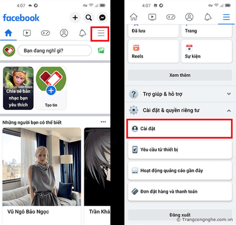Bước 1: Giao diện của ứng dụng chọn Menu 3 gạch góc bên phải trên cùng. Ứng dụng sẽ hiển thị màn hình về điều hướng bạn kéo xuống dưới cùng tại "Cài đặt & quyền riêng tư" chọn Cài đặt