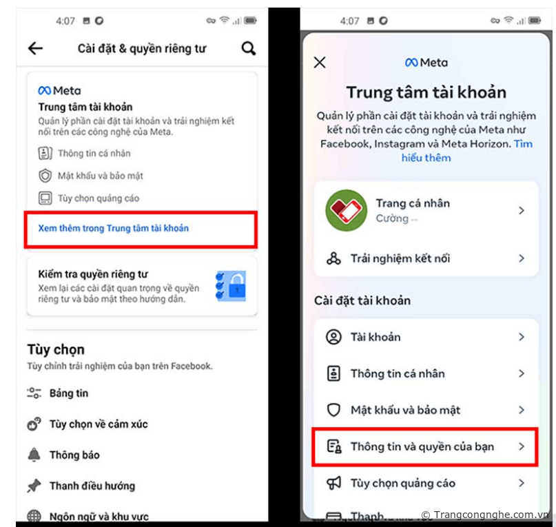 Bước 2: Tại đây bạn lựa chọn "Xem thêm trong Trung tâm tài khoản" -> "Thông tin và quyền hạn của bạn"