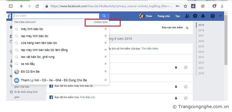 Bước 1: Tại cửa sổ trình duyệt Facebook bạn đưa con chuột lên khung tìm kiếm, hệ thống sẽ tự động show ra các tìm kiếm gần nhất mà bạn đã tìm kiếm. Trên khung "Tìm kiếm gần đây" bên phải có đoạn text "Chỉnh sửa". Bạn hãy lựa chọn